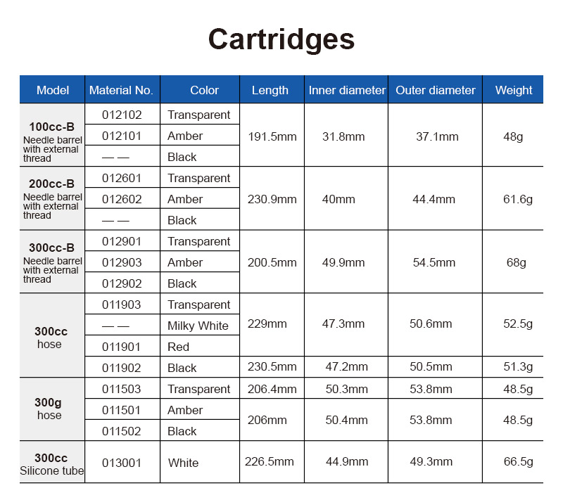 Glue dispensing syringes are divided into single-liquid, ABglue syringes, 300CC large glue dispensing syringes, etc. Single-liquid is usedfor single-component glue dispensing. AB glue cylinders are mainly used for thedispensing of double-liquid glue. Equipped with various types of AB glue gunsand static mixing tubes, they can not only automatically mix AB glue, but alsoare light and durable, and the amount of glue can be controlled at will. 300CClarge-capacity glue dispensing syringes, 300CC syringes are suitable for alarge number of glue dispensing operations, reducing the number of glue loadingtimes and improving work efficiency. It can be used directly as a syringe fordispensing, and the glue is clean when used. When adding materials, it is necessaryto add a feeding nozzle, a pressure regulating device, etc., adding materialsis very convenient, and the glue position can be visually observed, and it issuitable for various glues.