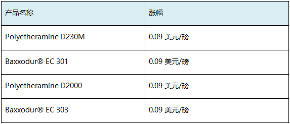 自2021年1月1日或合同允許時(shí)間起,巴斯夫公司將所有Lupranate®MDI產(chǎn)品的價(jià)格提高0.08美元/磅,Lupranate®TDI產(chǎn)品的價(jià)格上調(diào)0.09美元/磅,所有Pluracol多元醇的價(jià)格上調(diào)0.09美元/磅。