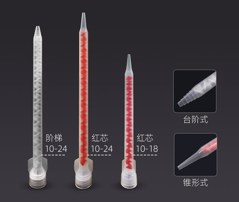 4、靜態(tài)攪拌器未端有多種型式設計,例如:依所的流量截取所需的出膠口徑,換頭,可轉接各種口徑針頭以配合小膠量之要求或軟管。用于涂抹或滴注各種雙組分膠粘劑或涂料,操作簡單,方便易用,能徹底解決雙組分膠粘產品混和不均勻的難題。